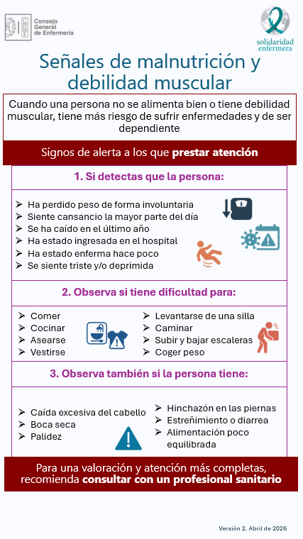 Para facilitar que la persona, independientemente de su situación, reciba la valoración y el apoyo adecuados, Solidaridad Enfermera ha elaborado la siguiente infografía divulgativa, dirigida a personas voluntarias, cuidadoras familiares y la población general. El contenido de este recurso se apoya en escalas de valoración clínica validadas, y utilizadas ampliamente por los profesionales sanitarios (como los cuestionarios Frail, SARC-F y Mini Nutritional Assessment).