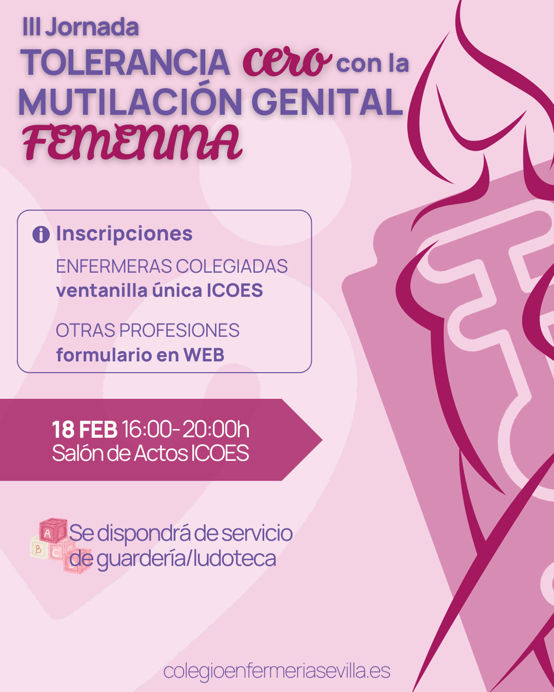 SEVILLA. 20 de enero de 2026.- La ONG del ICOES, Solidaridad Enfermera Sevilla, celebra ese 18 de febrero la III Jornada Tolerancia Cero con la Mutilación Genital Femenina dedicada a dar visibilidad a las víctimas de esta violación de los derechos humanos y de la infancia. El objetivo de la ONG es «conseguir con la sensibilización y formación de l@s profesionales sanitari@s y la ciudadanía, su erradicación», explica Vanessa Mata, coordinadora de Solidaridad Enfermera Sevilla.